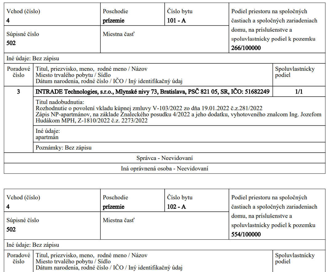 Podľa aktuálneho výpisu z listu vlastníctva došlo k rozparcelovaniu ubytovne Kosmalt na Luníku II na jednotlivé apartmány v roku 2021.