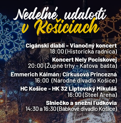 O 16:00 pokračuje operetné predstavenie Emmerich Kálmán: Cirkusová princezná v Národnom divadle Košice. Opereta kombinuje romantickú zápletku, cirkusové prostredie a hudobné melódie, predstavenie vzniklo v spolupráci s Baletom NDKE a Činohrou NDKE.