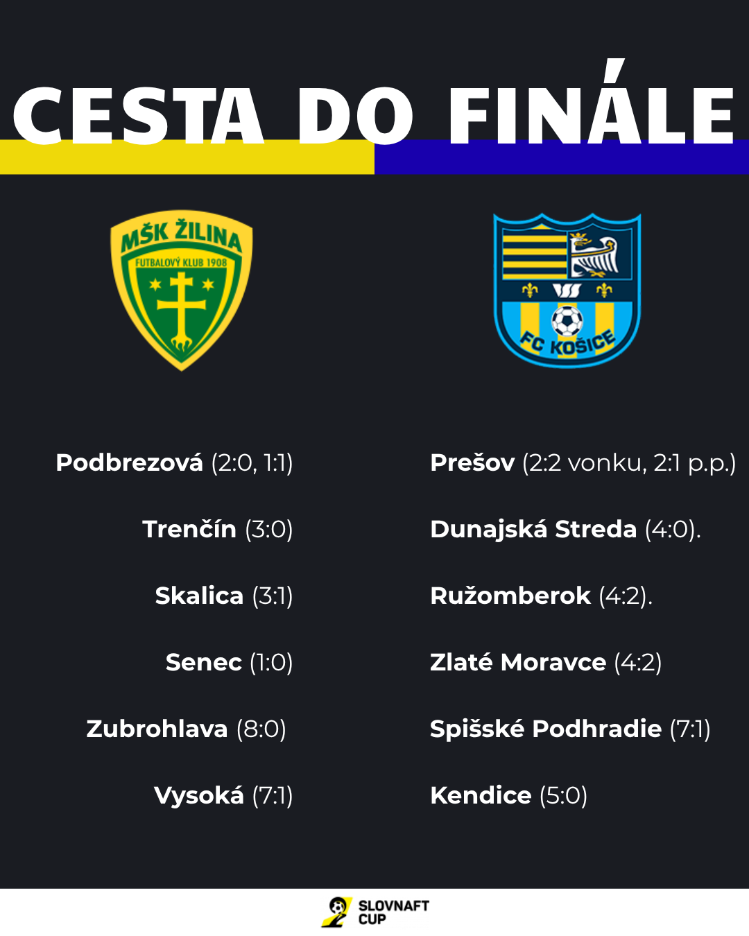 Košický futbal delí od prvej veľkej trofeje po dvanástich rokoch jediný zápas. V piatok 1. mája o 16:00 hod. sa pod Dubňom rozhodne o majiteľovi 20-kilogramovej trofeje. Domáca Žilina proti Košiciam. Finále, ktoré v aktuálnej sezóne sľubuje všetko, len nie nudný futbal.